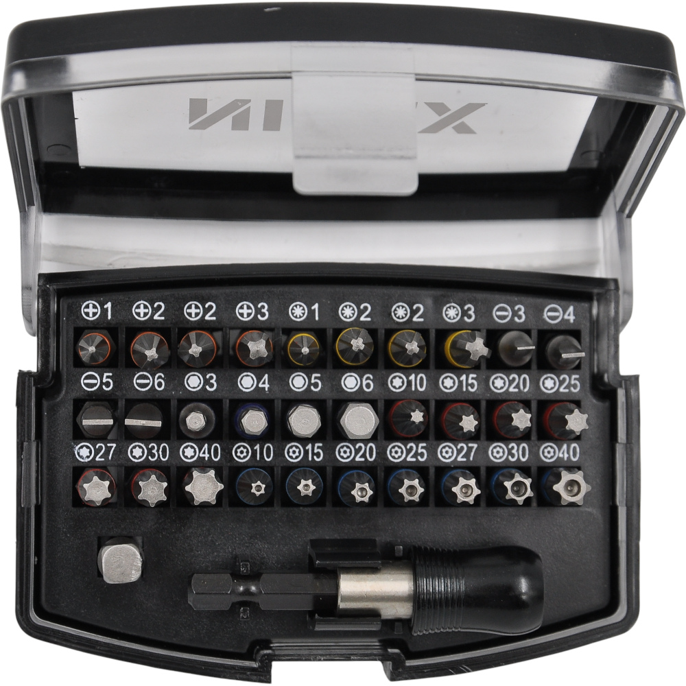 Биты 25 мм: PH1 - 1 шт.; РН2 - 2 шт.; PH3 - 1 шт.; PZ1 - 1 шт.; PZ1 - 2 шт.; SL3 - 1 шт.; SL4 - 1 шт.; SL5 - 1 шт.; SL6 - 1 шт.; H3 - 1 шт.; H4 - 1 шт.; H5 - 1 шт.; H6 - 1 шт.; Т10 - 1 шт.; Т15 - 1 шт.; Т20 - 1 шт.; Т25 - 1 шт.; Т27 - 1 шт.; Т30 - 1 шт.; Т40 - 1 шт.; Т10 - 1 шт.; Т15 - 1 шт.; Т20 - 1 шт.; Т25 - 1 шт.; Т27 - 1 шт.; Т30 - 1 шт.; Т40 - 1 шт.;